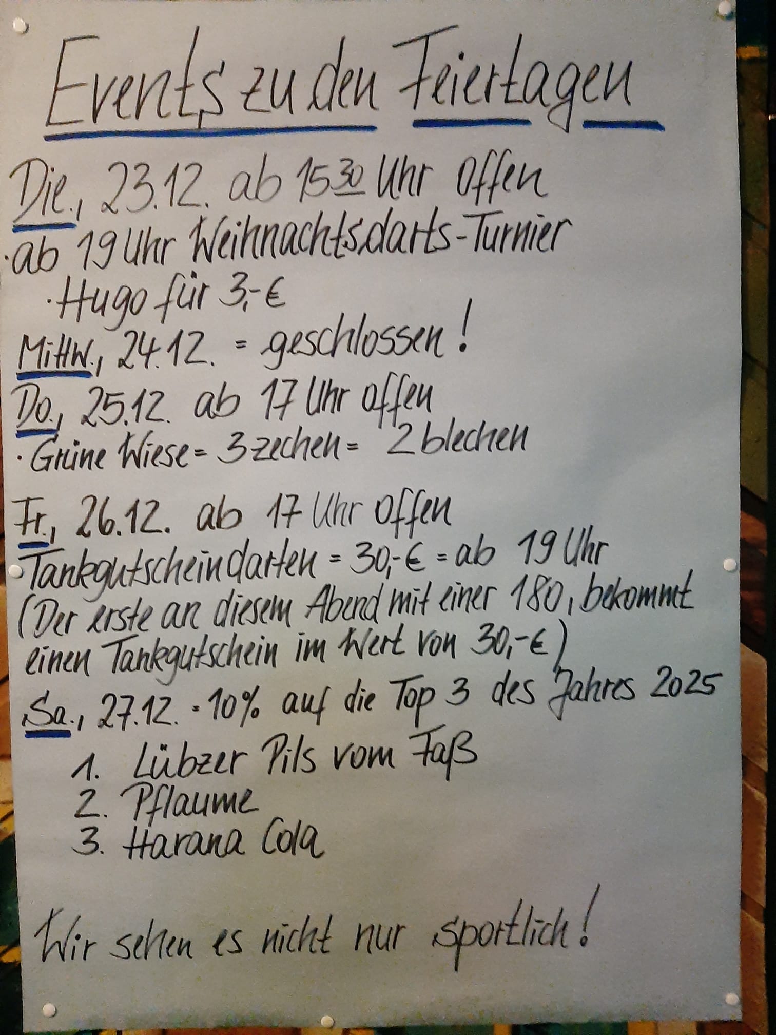 Sowohl Freunde des Kartenspiels und Brettspiels sind willkommen und erleben gemeinsam mit unseren sportbegeisterten Gästen, spannende sportliche Ansetzungen der 1. und 2. Fußball-Bundesliga, der UEFA Champions League, der UEFA Europa League, dem DFB-Pokal, die Spiele der Deutschen Nationalmannschaft, der DKB Handball-Bundesliga, Darts-Turniere und Spitzenbegegnungen der europäischen Fußball-Ligen.