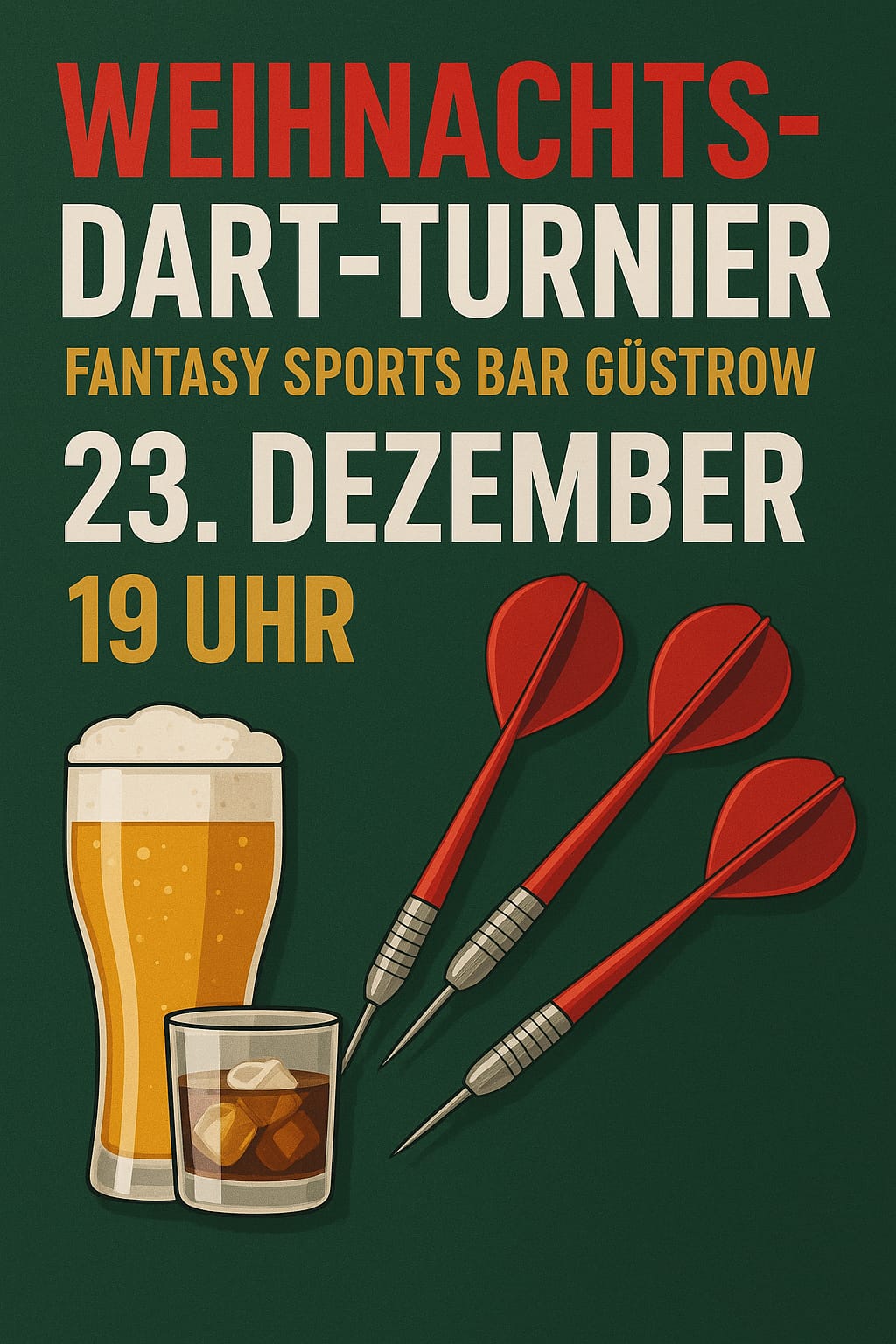 Traditionelles Weihnachts - Dartsturnier in Güstrows Sky Sportsbar Fantasy ! Dienstag 23. Dezember 2025 ab 19.00 Uhr Schon lange unter den Dartfreunden erwartet unser nächstes Dartsturnier für Einsteiger und natürlich auch die mit Leidenschaft spielenden Darter. Einen erlebnisreichen Abend als kleine vorherige Bescherung wünscht das Team der Sky Sportsbar Fantasy allen Dartfreunden im heutigen sportlichen Vergleich.... Voranmeldung Die. - So. ab 15.30 Uhr möglich unter Tel. : 03843 332076