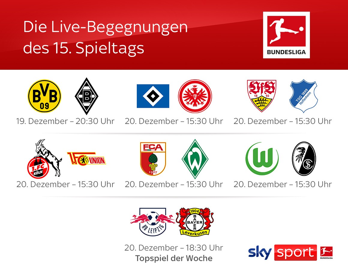 Die Sonntagsspiele der 1. Fußball Bundesliga der 15. Spieltag live ab 15.30 Uhr am 21. Dezember 2025