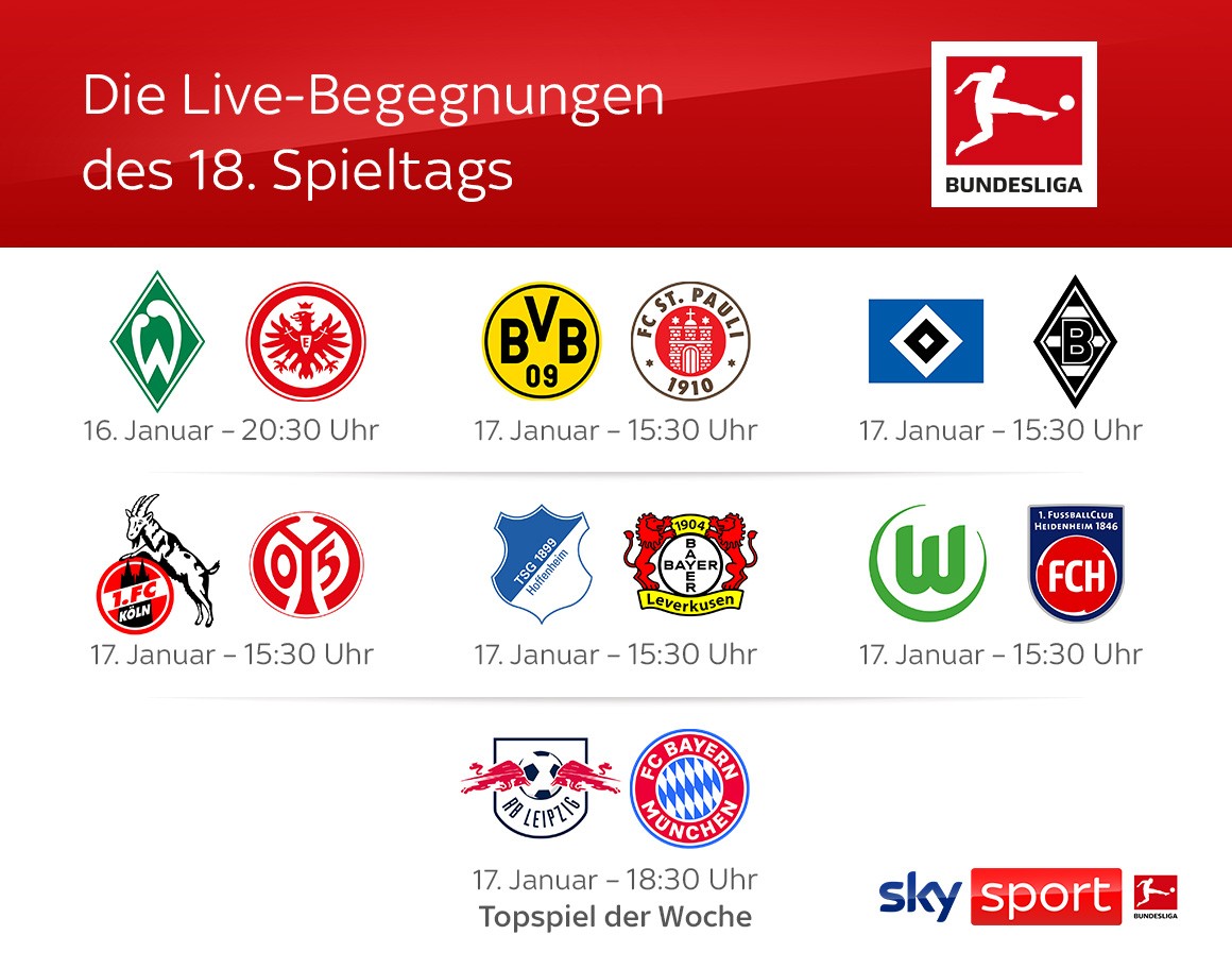18.Spieltag der 1. Fußball Bundesliga am Samstag 17. Januar 2026 ab 15.30 Uhr live erleben